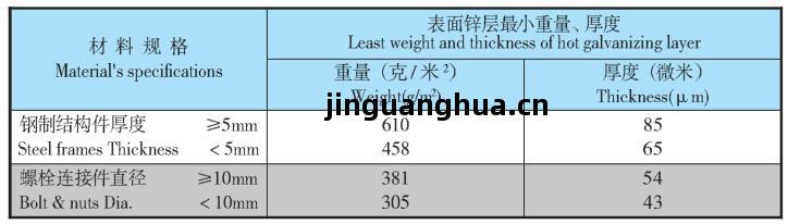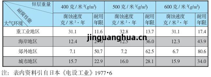 (2)鍍(du)鋅層附(fu)著(zhe)力符合(he)美(mei)國ASTM.A153-80《鋼鐵零件熱(re)浸(jin)鍍(du)鋅技術(shu)規範(fan)》中(zhong)的(de)撬(qiao)剝(bo)法(fa)及(ji)錘(chui)擊(ji)法的(de)要 求(qiu)。 (3)鍍(du)鋅層均勻(yun)性符合(he)GB2025-12《低(di)壓(ya)流體輸(shu)送用鍍(du)鋅焊接鋼管》或美國ANS1.C.80.1.1977《剛(gang)性 鋼導管鍍(du)鋅規範》中(zhong)的(de)“硫酸銅浸漬法”規(gui)定。 (4)鍍(du)鋅層耐腐(fu)性能(neng)參見鍍(du)鋅層平均腐(fu)蝕速度(du)試驗(yan)數據。