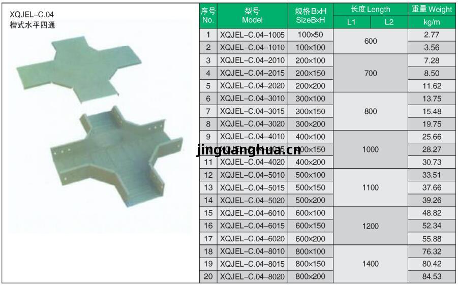 XQJEL_C.04槽(cao)式(shi)水(shui)平(ping)四通(tong)產(chan)品(pin)型(xing)號、規格、重(zhong)量(liang)等(deng)參(can)數(shu)及XQJEL_C槽(cao)式(shi)電(dian)纜(lan)橋架在不同跨(kua)距下允(yun)許均(jun)布載(zai)荷變形(xing)量(liang)。
